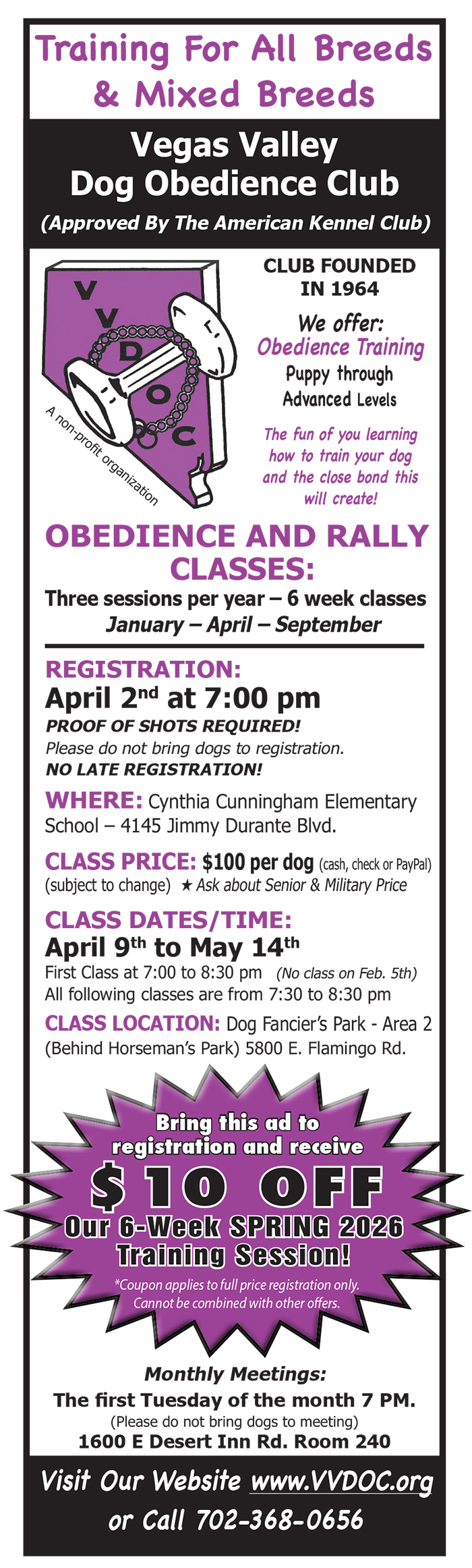 Vegas Valley Dog Obedience Club » Advertiser Directory Go back to directory.Add to Address Book.Vegas Valley Dog Obedience ClubVegas Valley Dog Obedience ClubObedience Training – Puppy through Advanced LevelsWork Phone: (702) 368-0656workWebsite: www.VVDOC.orgBiographical InfoCategories: Dog TrainingUpdated 2 months ago.